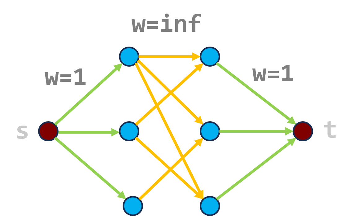 其中两侧的蓝点分别对应二分图的两个点集,中间橙色的边对应二分图的边(橙色边的边权可以是 \(1\),但是为了方便理解后面的最小点覆盖,我们将其赋为 \(+\infty\),显然也不会影响时间复杂度)。正确性显然。
